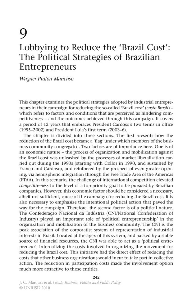 Author: Wagner Pralon Mancuso Abstract: This chapter examines the political strategies adopted by industrial entrepreneurs in their campaign for reducing the so-called ‘Brazil cost’ (custo Brasil) — which refers to factors and conditions that are perceived as hindering competitiveness — and the outcomes achieved through this campaign. It covers a […]