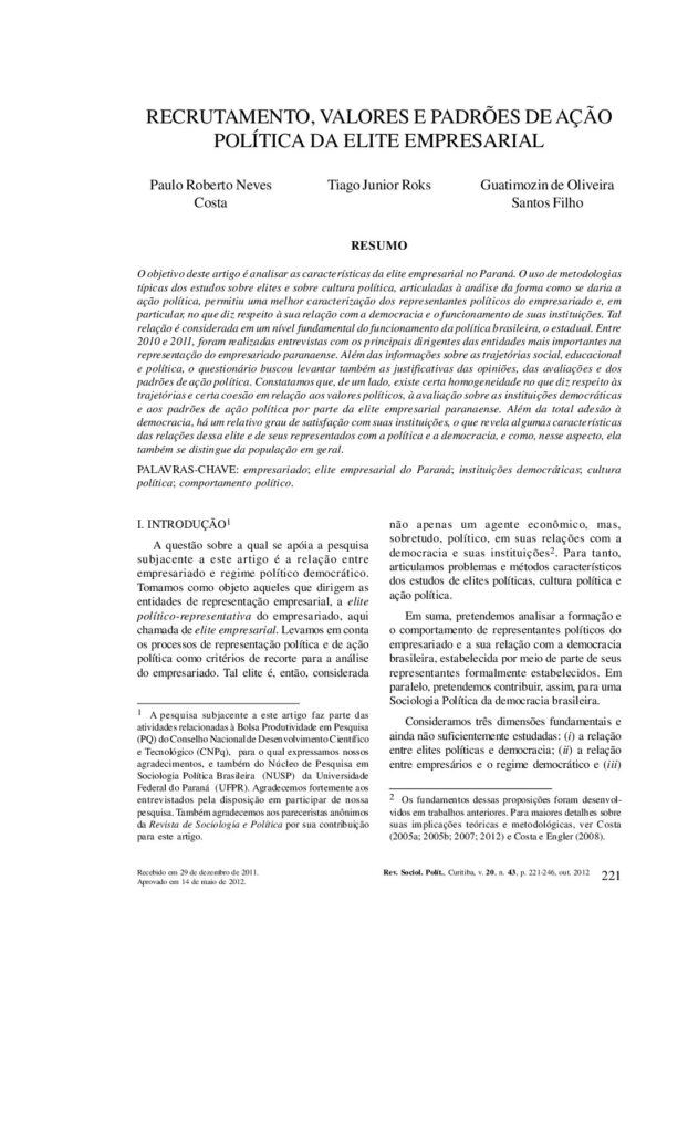 Authors: Paulo Roberto Neves Costa, Tiago Junior Roks and Guatimozin de Oliveira Santos Filho. Abstract: This article sets out to analyze the characteristics of the entrepreneurial elite of the state of Paraná. Our use of typical methodologies for the study of elites and political culture, articulated for analysis of particular […]