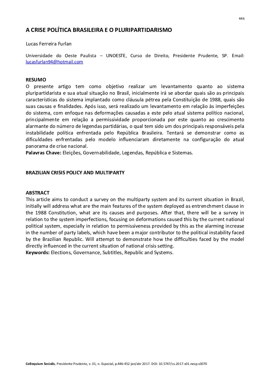 This article aims to conduct a survey on the multiparty system and its current situation in Brazil, initially will address what are the main features of the system deployed as entrenchment clause in the 1988 Constitution, what are its causes and purposes. After that, there will be a survey in relation to the system imperfections, focusing on deformations caused this by the current national political system, especially in relation to permissiveness provided by this as the alarming increase in the number of party labels, which have been a major contributor to the political instability faced by the Brazilian Republic. Will attempt to demonstrate how the difficulties faced by the model directly influenced in the current situation of national crisis setting.