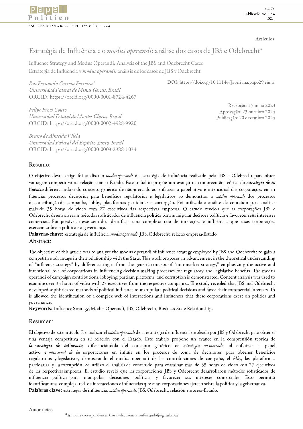 The objective of this article was to analyze the modus operandi of influence strategy employed by JBS and Odebrecht to gain a competitive advantage in their relationship with the State. This work proposes an advancement in the theoretical understanding of “influence strategy” by differentiating it from the generic concept of “non-market strategy,” emphasizing the active and intentional role of corporations in influencing decision-making processes for regulatory and legislative benefits. The modus operandi of campaign contributions, lobbying, partisan platforms, and corruption is demonstrated. Content analysis was used to examine over 35 hours of video with 27 executives from the respective companies. The study revealed that JBS and Odebrecht developed sophisticated methods of political influence to manipulate political decisions and favor their commercial interests. This allowed the identification of a complex web of interactions and influences that these corporations exert on politics and governance.
