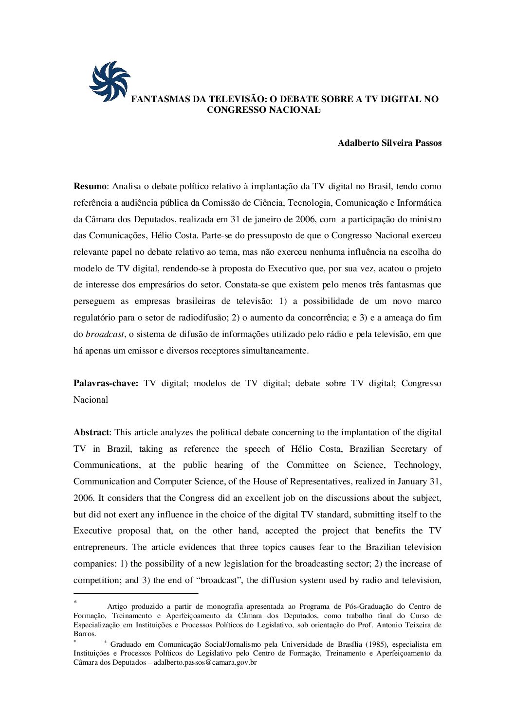 Analisa o debate político relativo à implantação da TV digital no Brasil, tendo como referência a audiência pública da Comissão de Ciência, Tecnologia, Comunicação e Informática da Câmara dos Deputados, realizada em 31 de janeiro de 2006, com a participação do ministro das Comunicações, Hélio Costa. Parte-se do pressuposto de que o Congresso Nacional exerceu relevante papel no debate relativo ao tema, mas não exerceu nenhuma influência na escolha do modelo de TV digital, rendendo-se à proposta do Executivo que, por sua vez, acatou o projeto de interesse dos empresários do setor. Constata-se que existem pelo menos três fantasmas que perseguem as empresas brasileiras de televisão: 1) a possibilidade de um novo marco regulatório para o setor de radiodifusão; 2) o aumento da concorrência; e 3) e a ameaça do fim do broadcast, o sistema de difusão de informações utilizado pelo rádio e pela televisão, em que há apenas um emissor e diversos receptores simultaneamente.