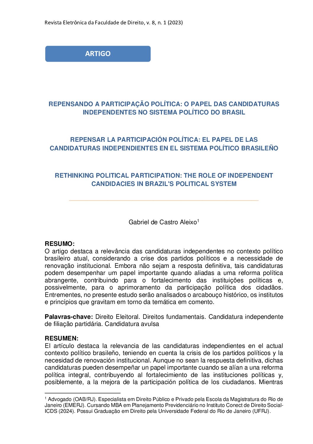 Autor: Gabriel de Castro Aleixo Resumo: O artigo destaca a relevância das candidaturas independentes no contexto político brasileiro atual, considerando a crise dos partidos políticos e a necessidade de renovação institucional. Embora não sejam a resposta definitiva, tais candidaturas podem desempenhar um papel importante quando aliadas a uma reforma política […]